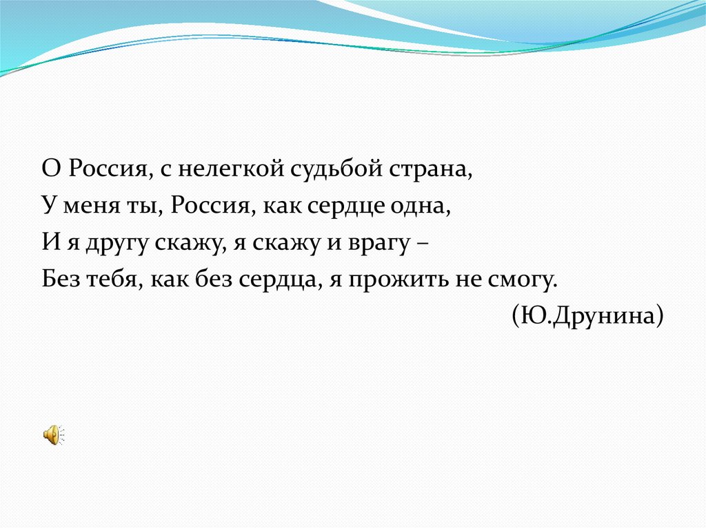 О Россия, с нелегкой судьбой страна,У меня ты, Россия, как сердце одна,