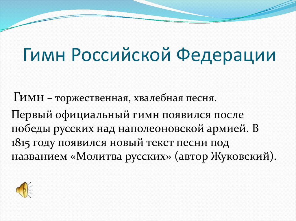 Гимн Российской ФедерацииГимн – торжественная, хвалебная песня.
