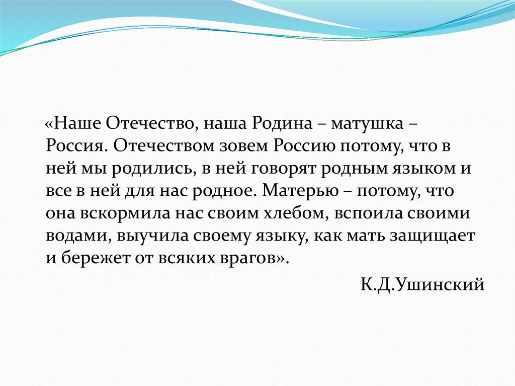 «Наше Отечество, наша Родина – матушка –Россия. Отечеством зовем Россию потому, что в
