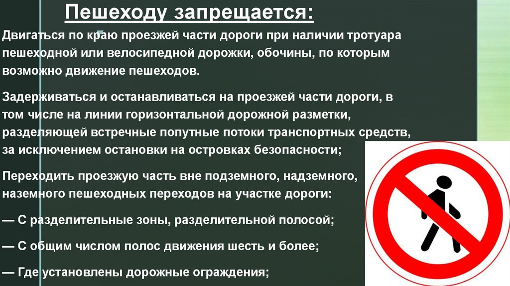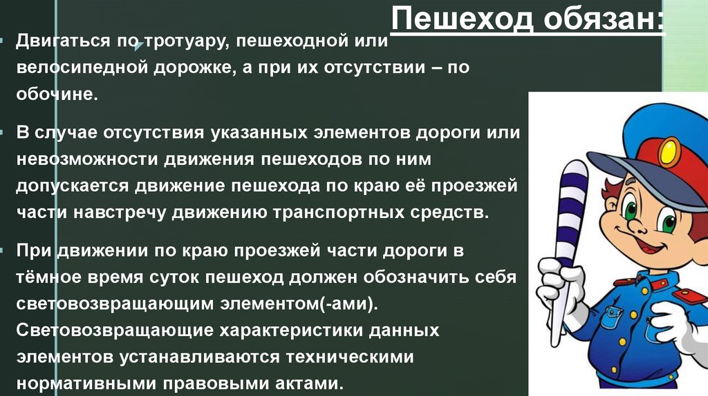 Двигаться поzтротуару, пешеходной илиПешеход обязан: