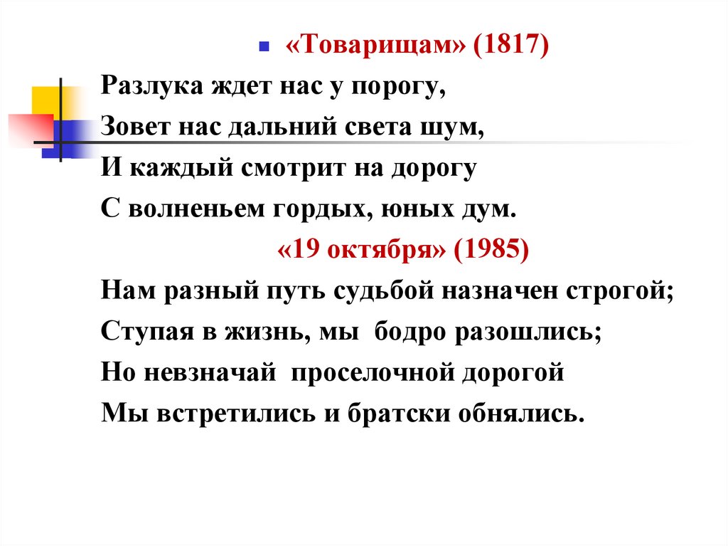 «Товарищам» (1817)Разлука ждет нас у порогу,