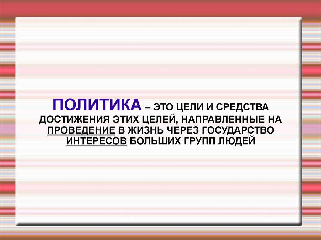 ПОЛИТИКА – ЭТО ЦЕЛИ И СРЕДСТВАДОСТИЖЕНИЯ ЭТИХ ЦЕЛЕЙ, НАПРАВЛЕННЫЕ НА