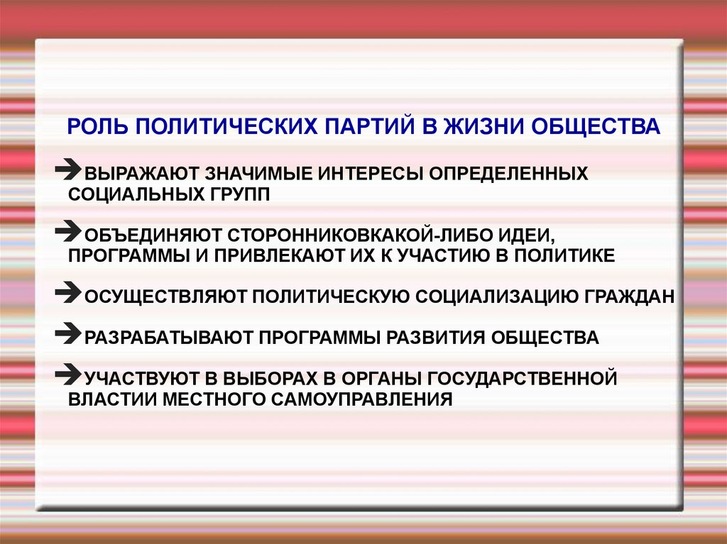 РОЛЬ ПОЛИТИЧЕСКИХ ПАРТИЙ В ЖИЗНИ ОБЩЕСТВАВЫРАЖАЮТ ЗНАЧИМЫЕ ИНТЕРЕСЫ ОПРЕДЕЛЕННЫХ