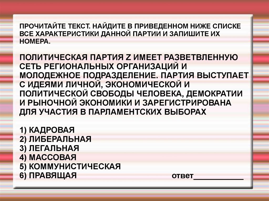 ПРОЧИТАЙТЕ ТЕКСТ. НАЙДИТЕ В ПРИВЕДЕННОМ НИЖЕ СПИСКЕВСЕ ХАРАКТЕРИСТИКИ ДАННОЙ ПАРТИИ И ЗАПИШИТЕ ИХ