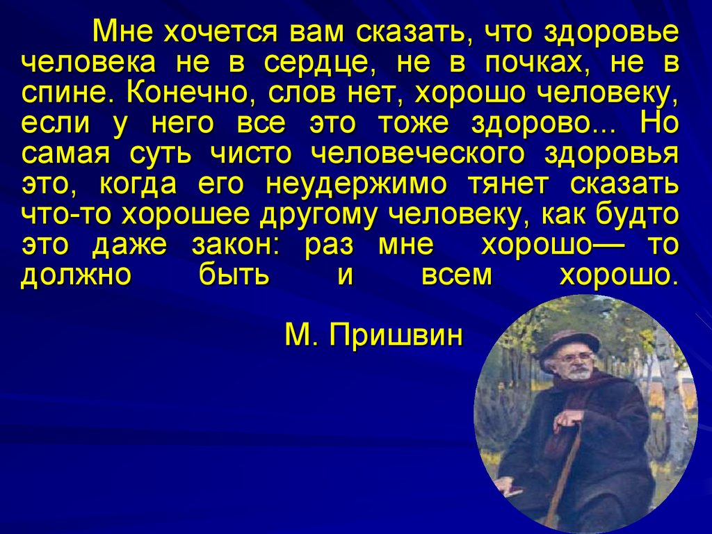 Мне хочется вам сказать, что здоровьечеловека не в сердце, не в почках, не в