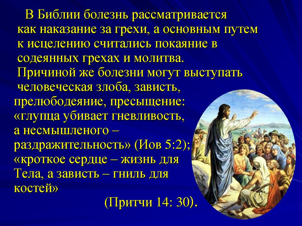 В Библии болезнь рассматриваетсякак наказание за грехи, а основным путем
