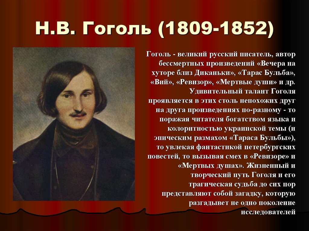 Н.В. Гоголь (1809-1852)Гоголь - великий русский писатель, автор