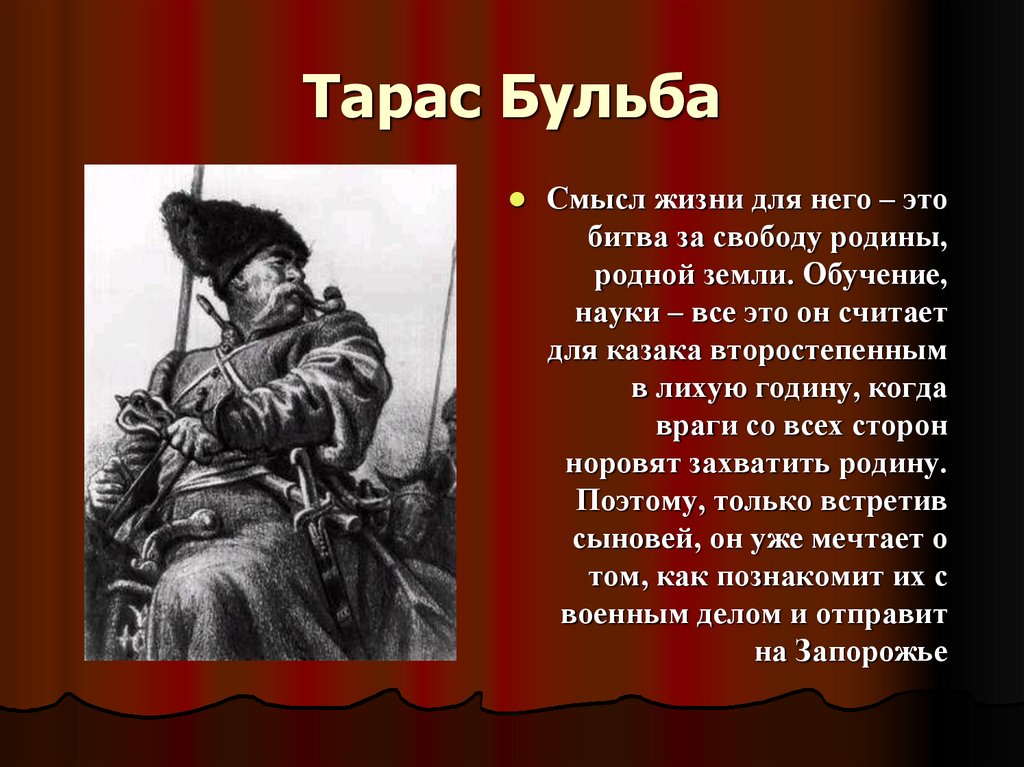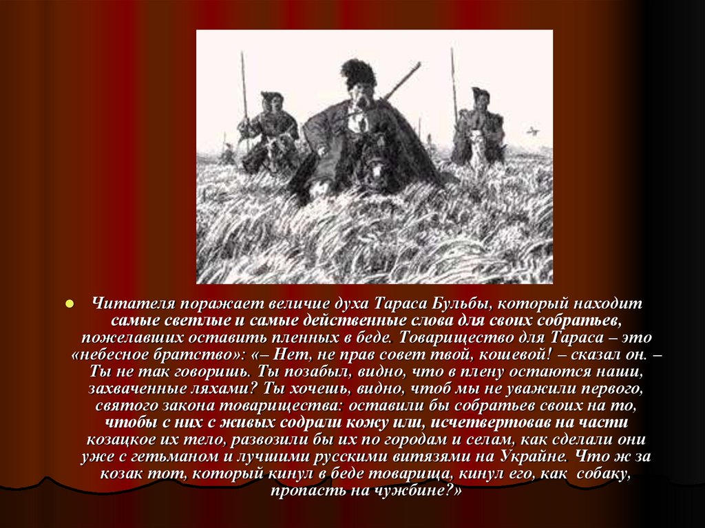 Читателя поражает величие духа Тараса Бульбы, который находитсамые светлые и самые действенные слова для своих собратьев,