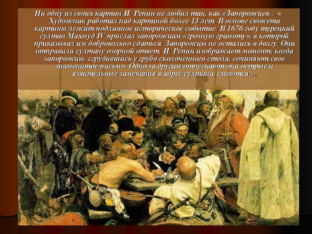 Ни одну из своих картин И. Репин не любил так, как «Запорожцев…».Художник работал над картиной более 13 лет. В основе сюжета