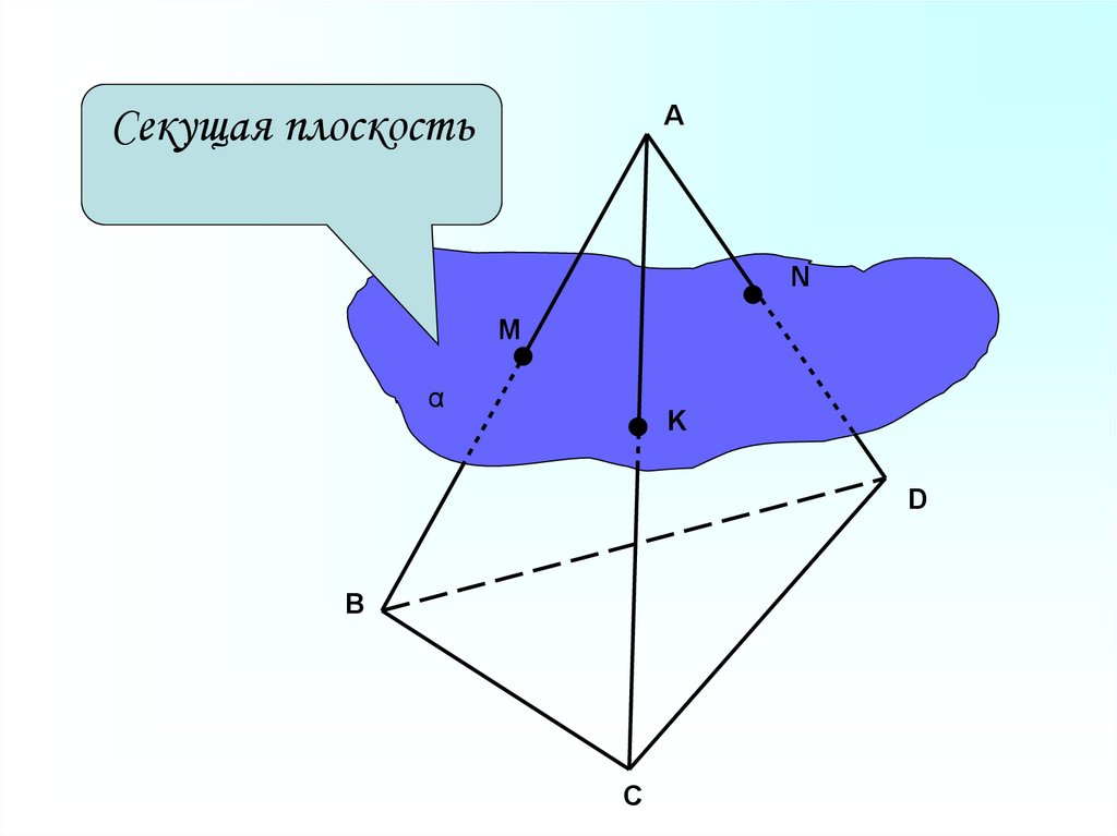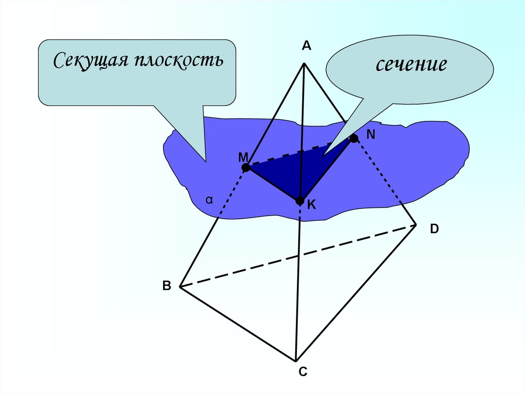 • Секущей плоскостью многогранника назовем любую плоскость,по обе стороны от которой имеются точки данного