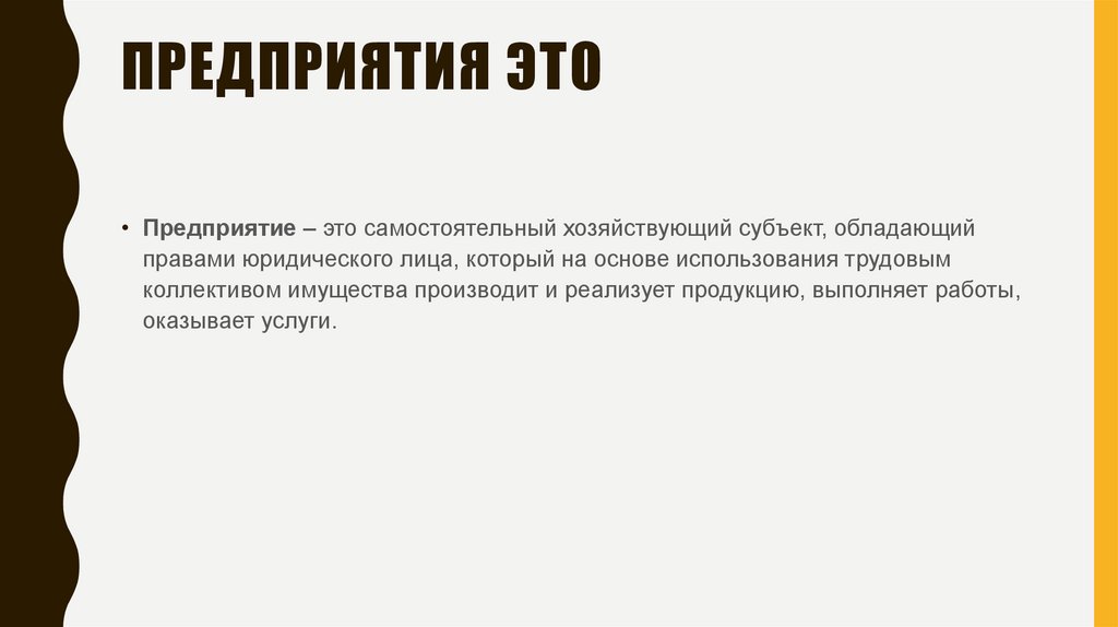 ПРЕДПРИЯТИЯ ЭТО• Предприятие – это самостоятельный хозяйствующий субъект, обладающий