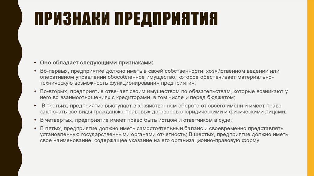 • Во-первых, предприятие должно иметь в своей собственности, хозяйственном ведении или