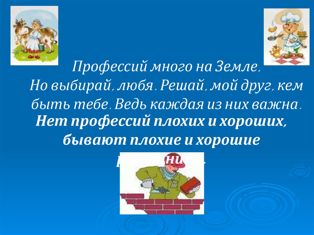 Профессий много на Земле,Но выбирай, любя. Решай, мой друг, кем