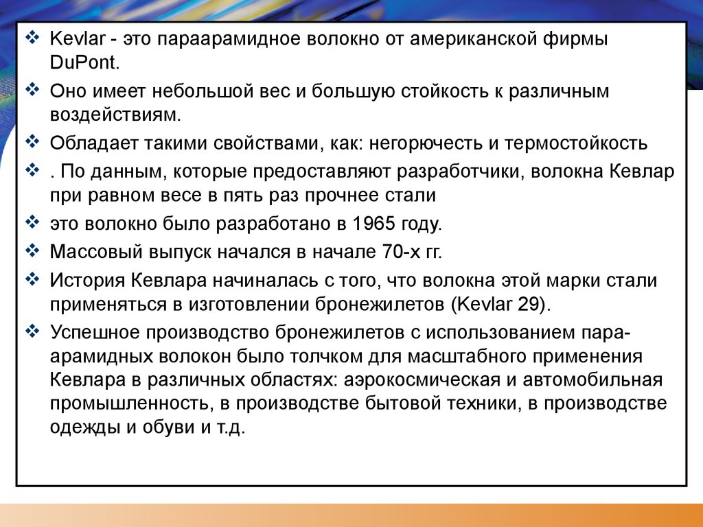 применяться в изготовлении бронежилетов (Kevlar 29).