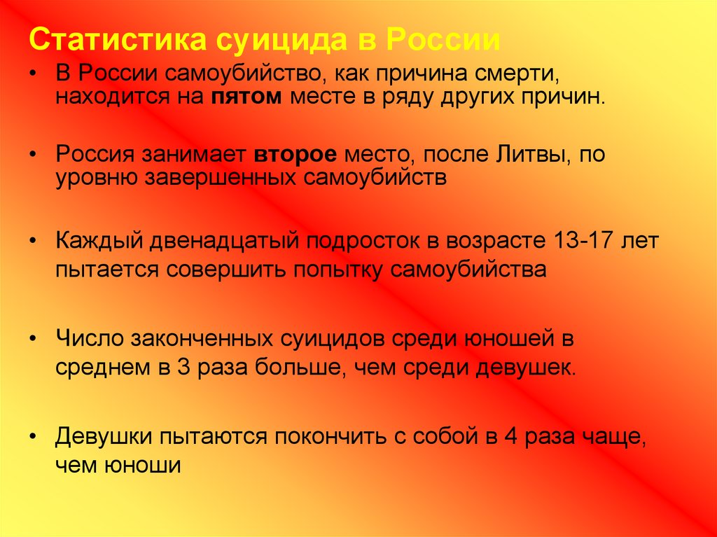 Статистика суицида в России• В России самоубийство, как причина смерти,