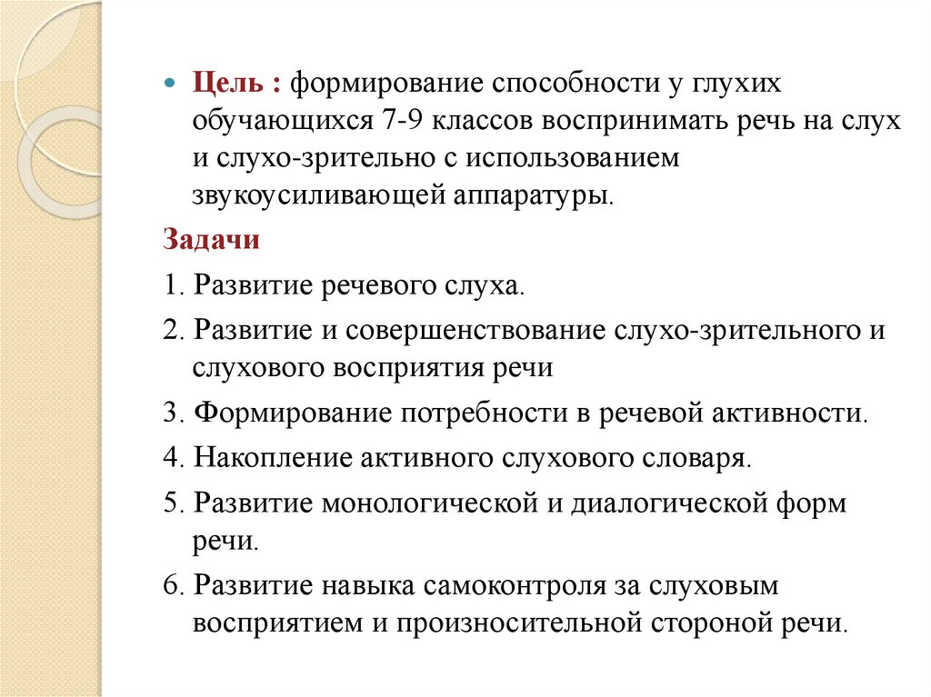 Цель : формирование способности у глухихобучающихся 7-9 классов воспринимать речь на слух