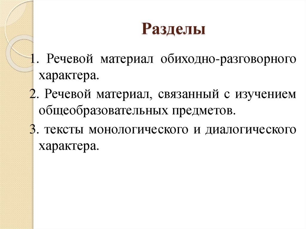 текстов описательно-повествовательного характера, текстов-диалогов, фразвопросов, фраз-поручений, заданий, словосочетаний и слов. Речевой материал