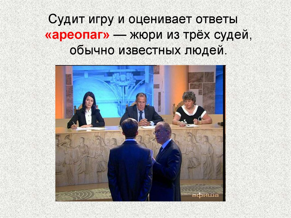Судит игру и оценивает ответы«ареопаг» — жюри из трёх судей,