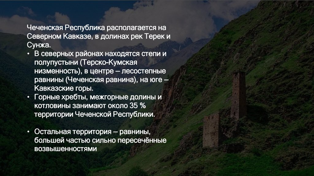 Чеченская Республика располагается наСеверном Кавказе, в долинах рек Терек и