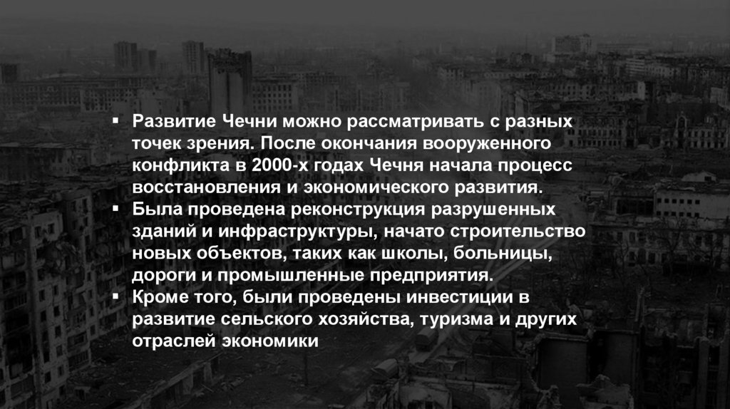 Развитие Чечни можно рассматривать с разныхточек зрения. После окончания вооруженного