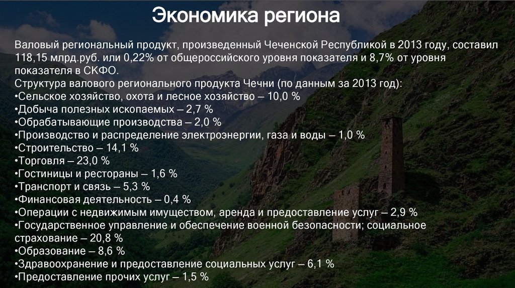 Экономика регионаВаловый региональный продукт, произведенный Чеченской Республикой в 2013 году, составил