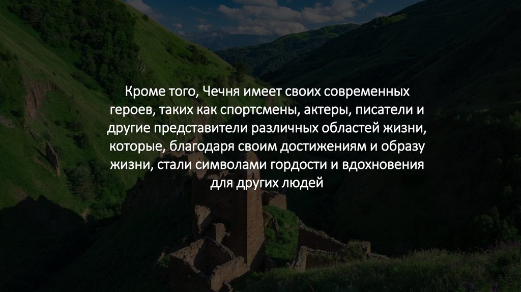 Кроме того, Чечня имеет своих современныхгероев, таких как спортсмены, актеры, писатели и
