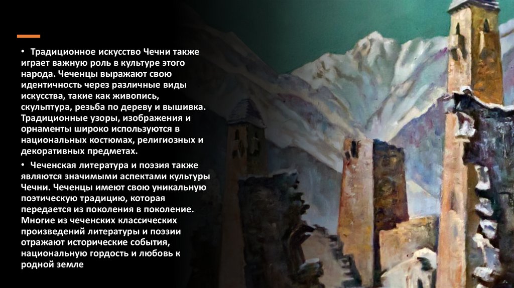 • Традиционное искусство Чечни такжеиграет важную роль в культуре этого
