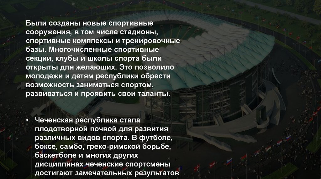 Были созданы новые спортивныесооружения, в том числе стадионы,