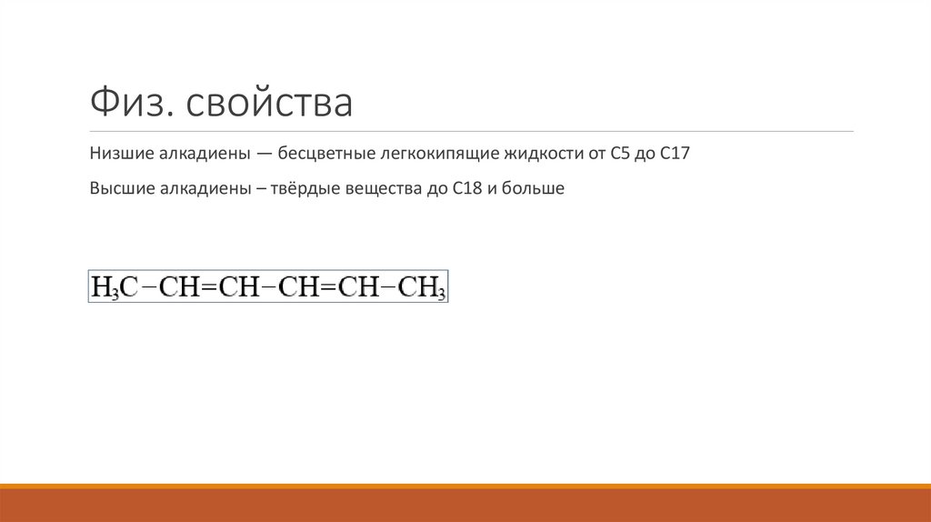 Физ. свойстваНизшие алкадиены — бесцветные легкокипящие жидкости от С5 до С17