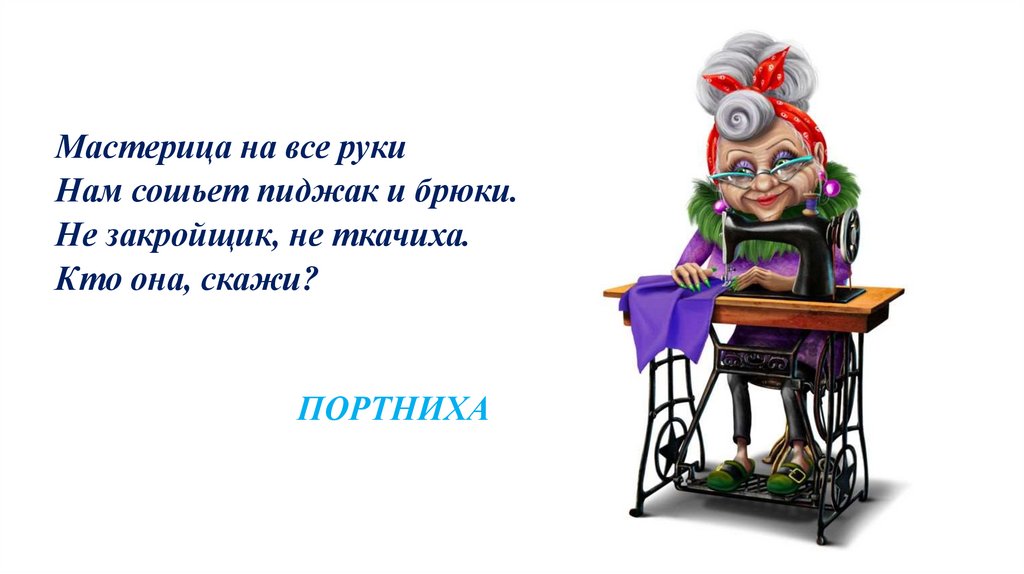 Мастерица на все рукиНам сошьет пиджак и брюки.