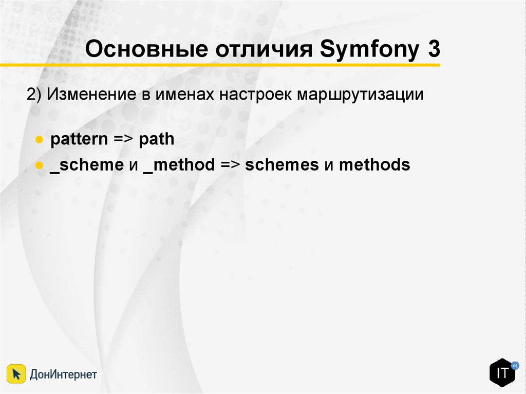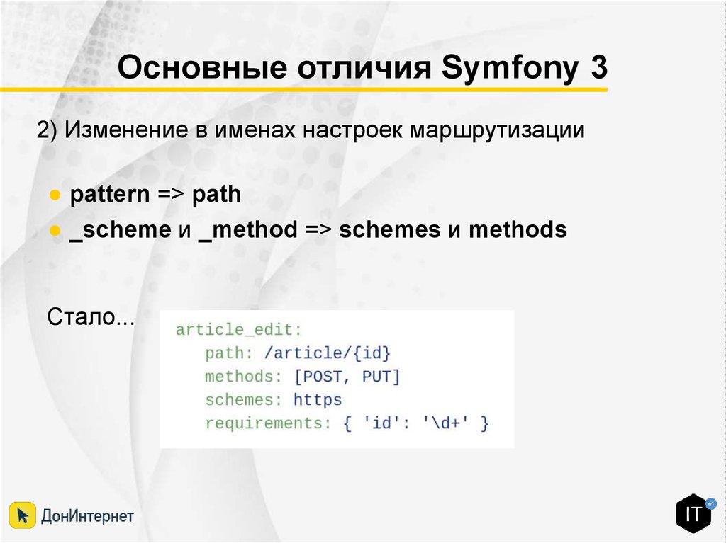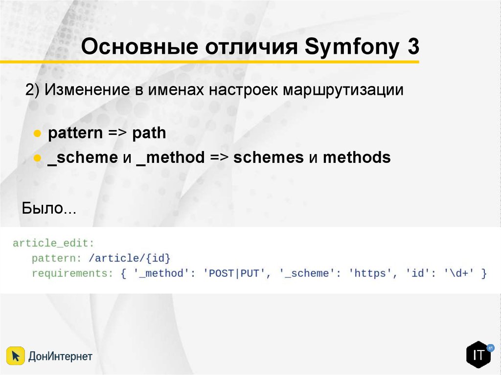 Основные отличия Symfony 32) Изменение в именах настроек маршрутизации