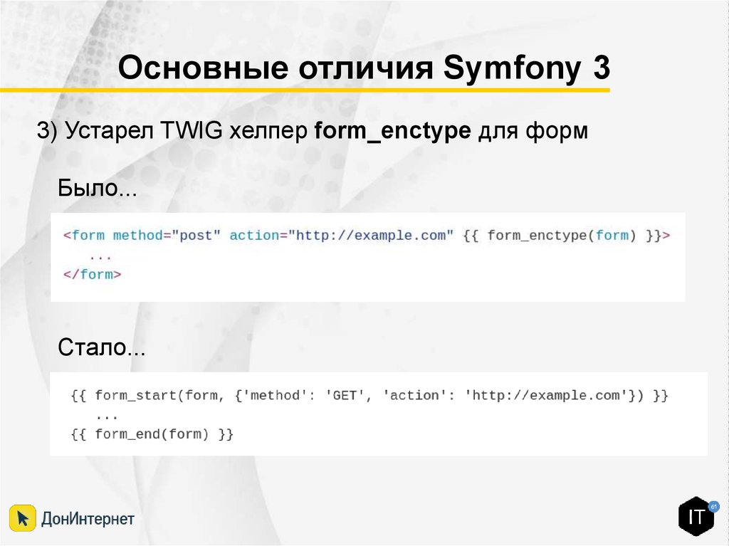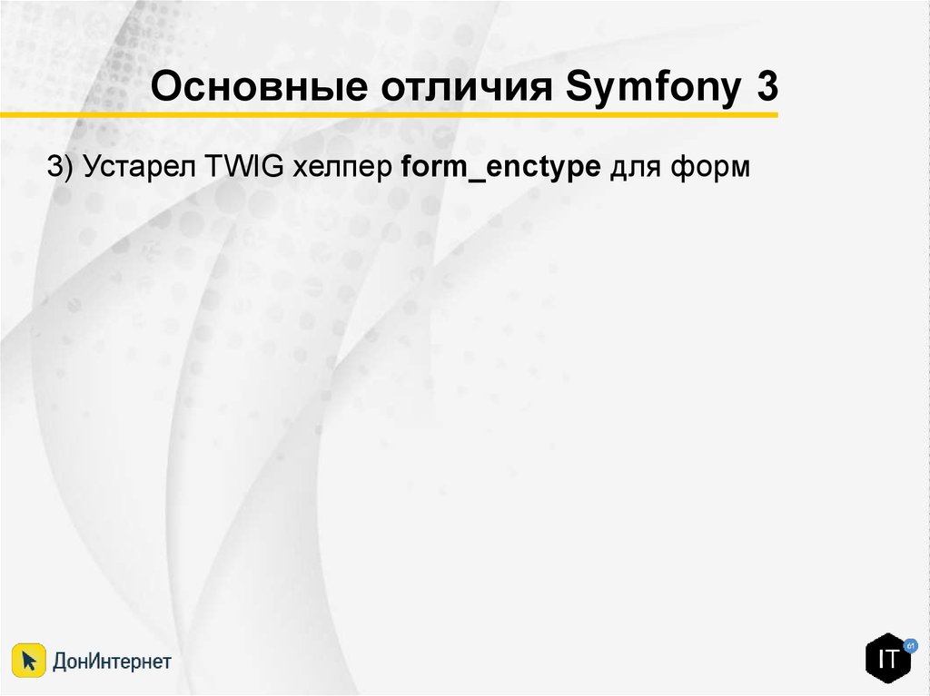 Основные отличия Symfony 33) Устарел TWIG хелпер form_enctype для форм