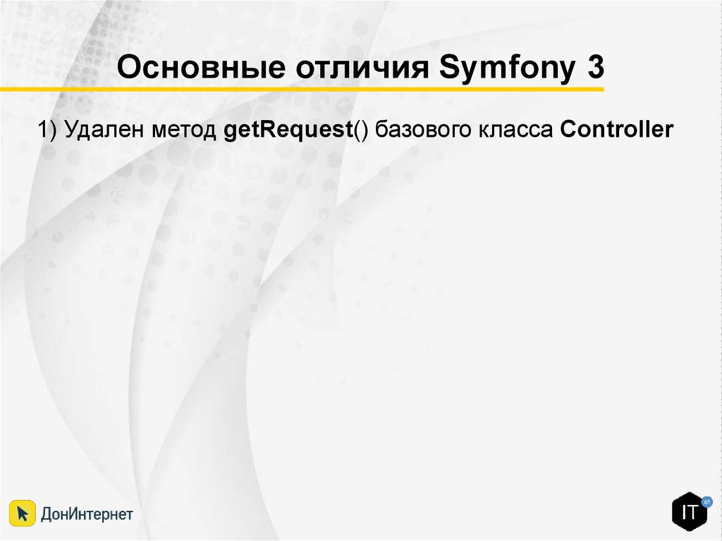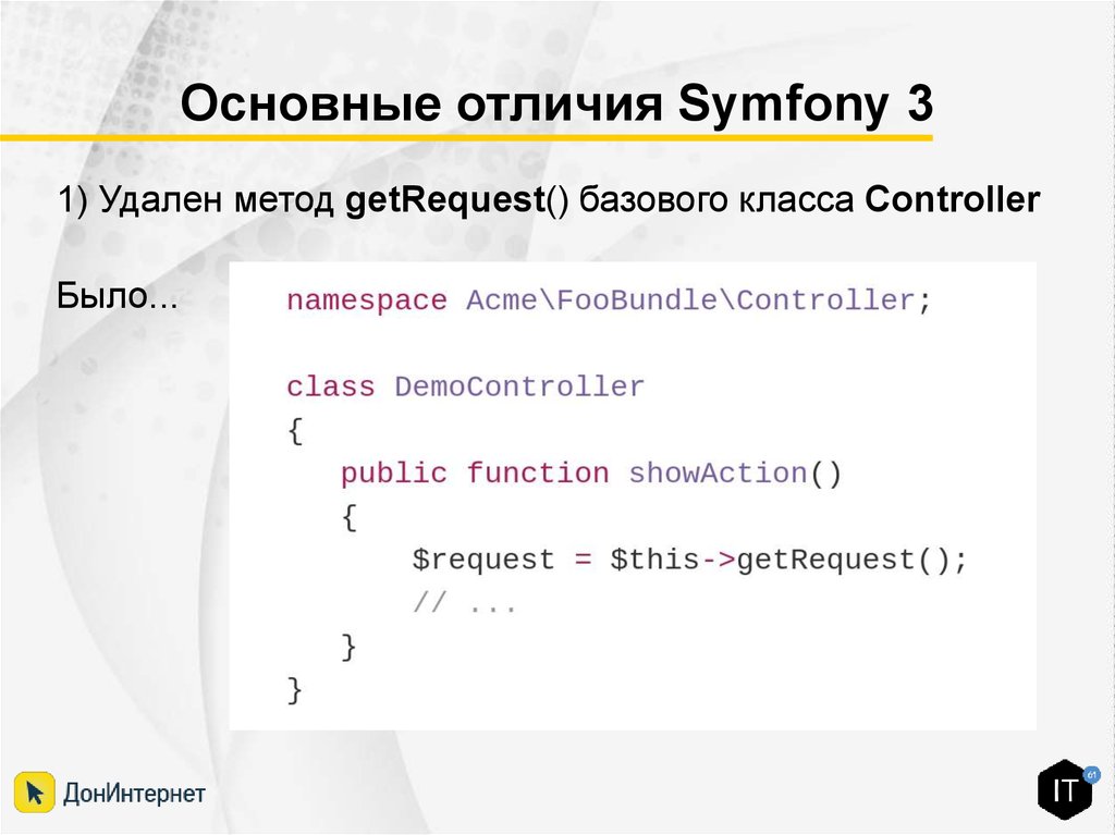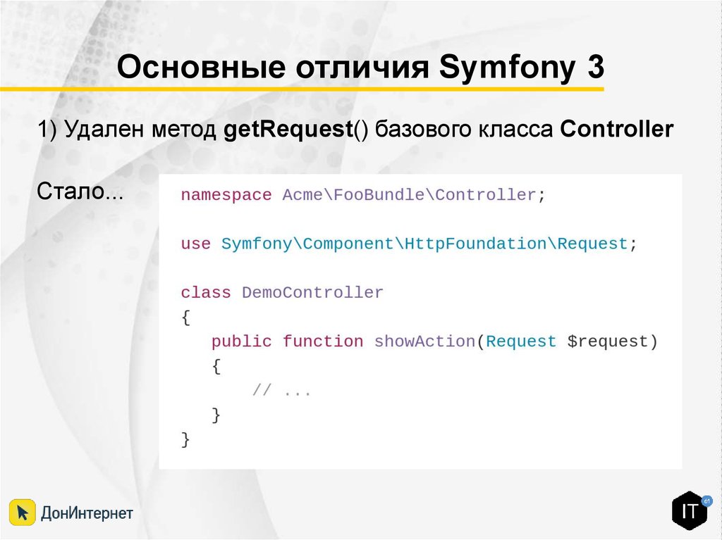 Основные отличия Symfony 31) Удален метод getRequest() базового класса Controller