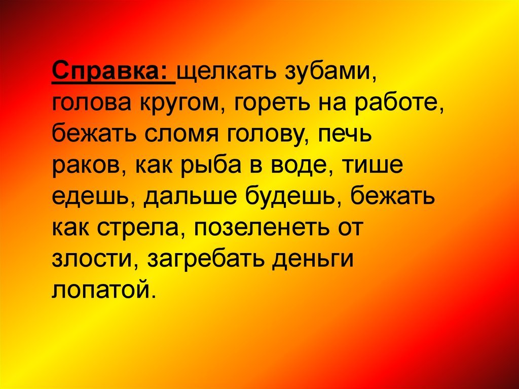Справка: щелкать зубами,голова кругом, гореть на работе,