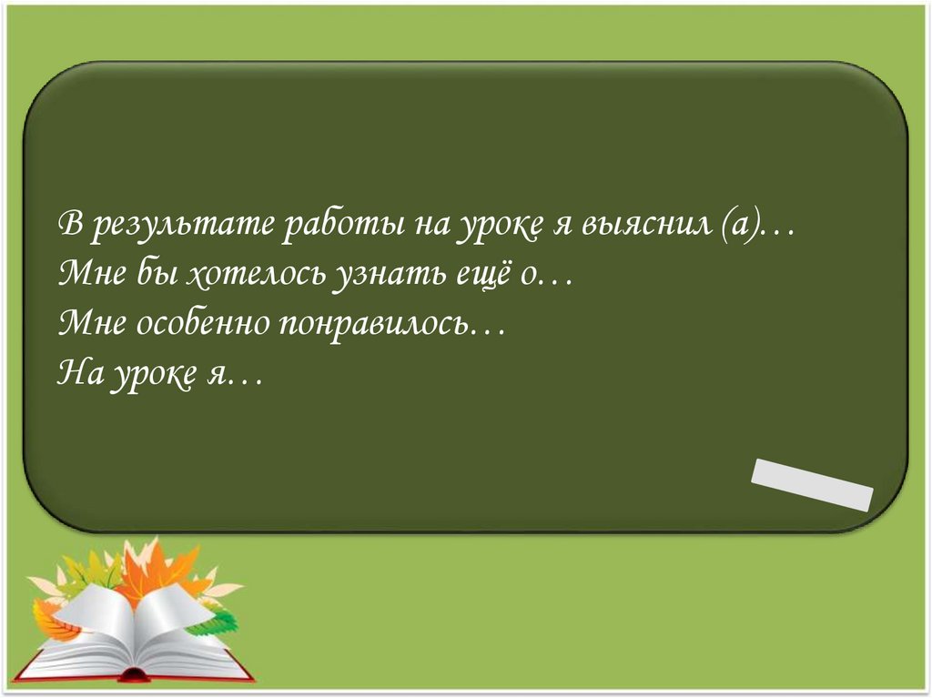 В результате работы на уроке я выяснил (а)…Мне бы хотелось узнать ещё о…