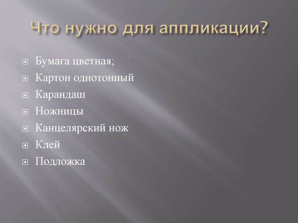 Аппликация (от лат. «прикладывание») — интересный вид художественнойдеятельности — это способ работы с цветными кусочками различных