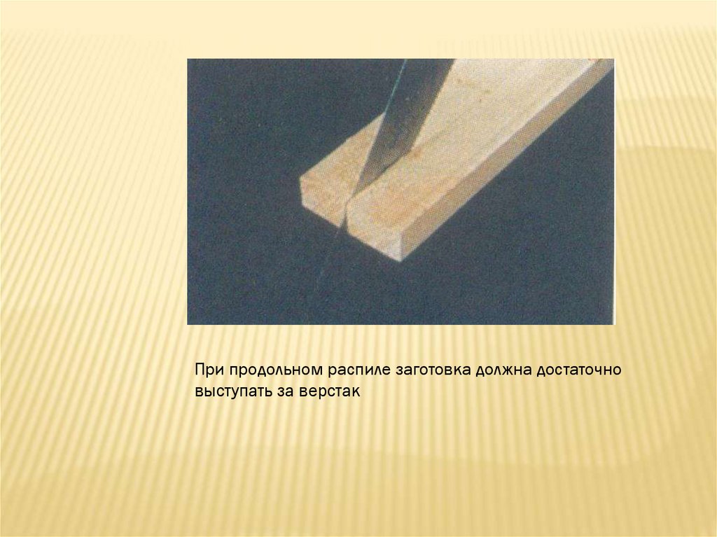 При продольном распиле заготовка должна достаточновыступать за верстак