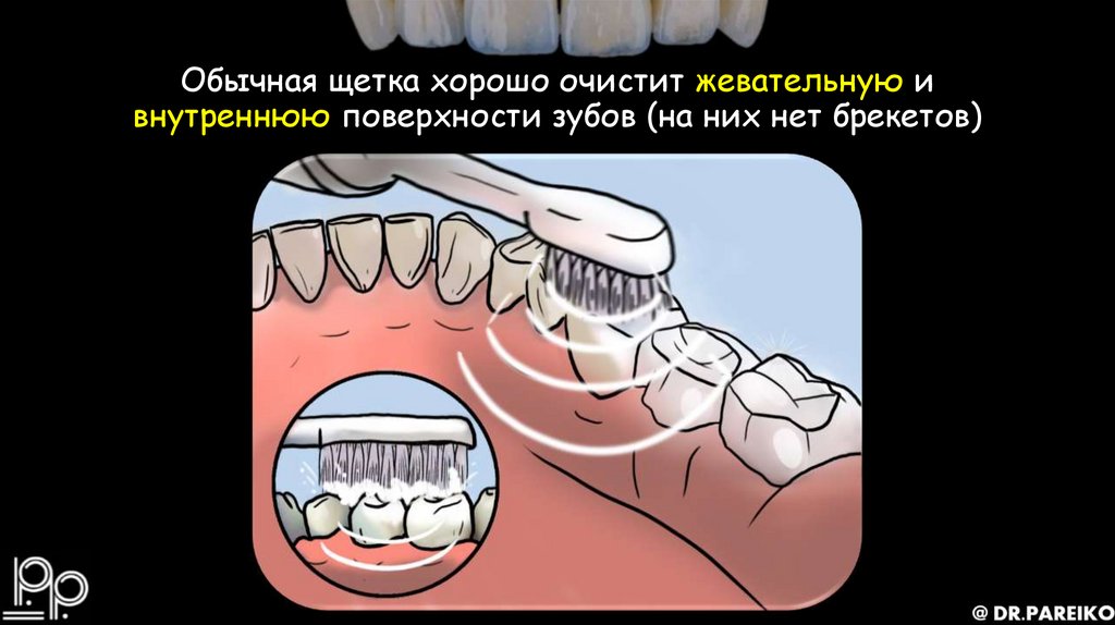 Обычная щетка хорошо очистит жевательную ивнутреннюю поверхности зубов (на них нет брекетов)