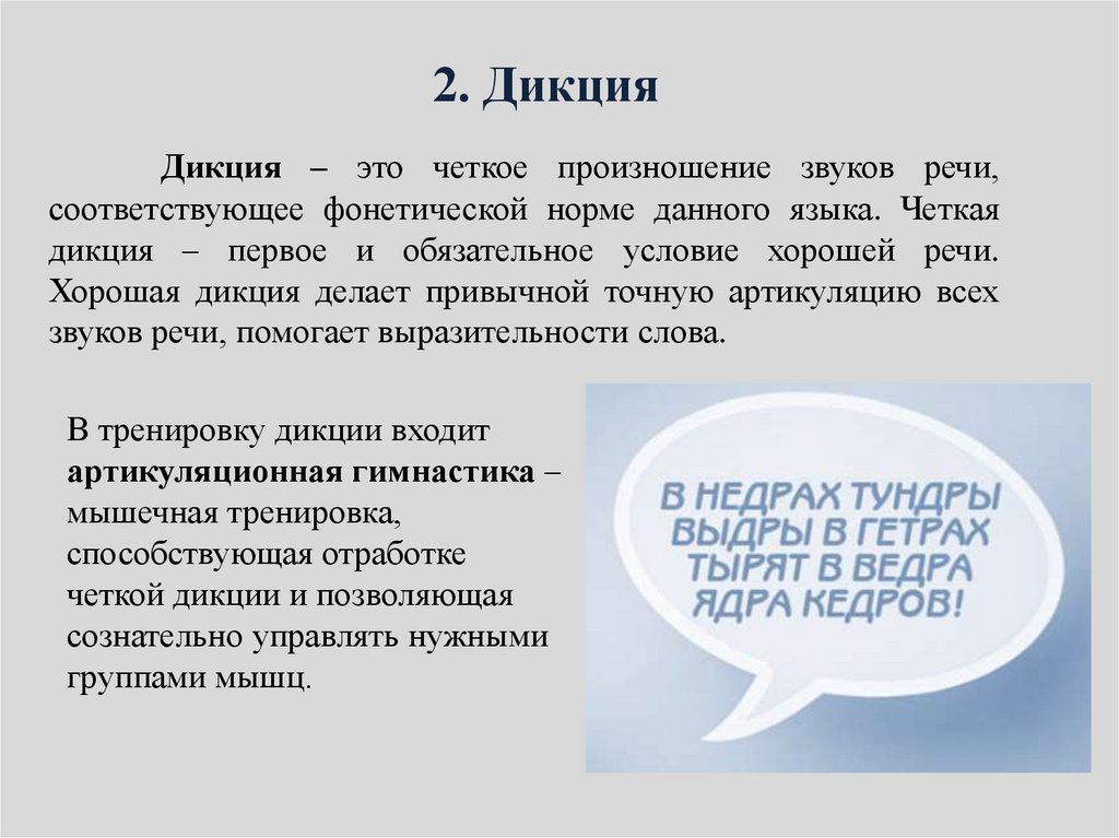 2. ДикцияДикция – это четкое произношение звуков речи,