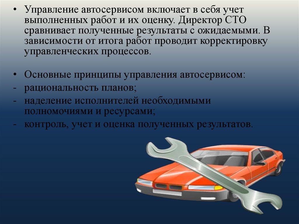 • Управление автосервисом включает в себя учетвыполненных работ и их оценку. Директор СТО