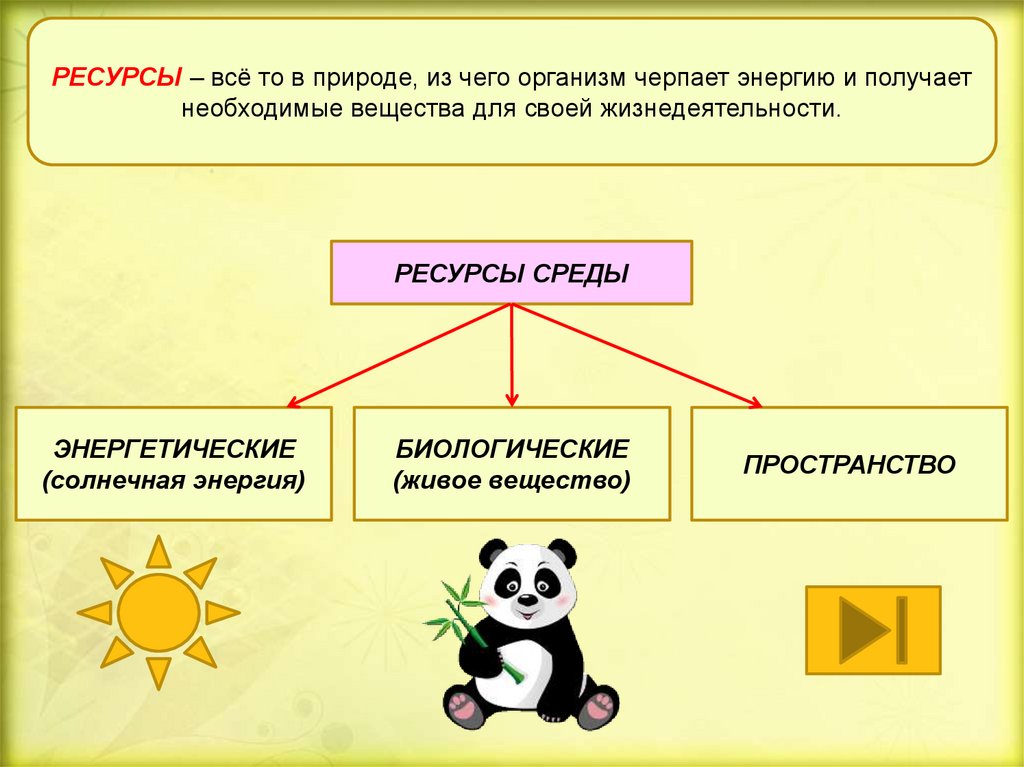 РЕСУРСЫ – всё то в природе, из чего организм черпает энергию и получаетнеобходимые вещества для своей жизнедеятельности.