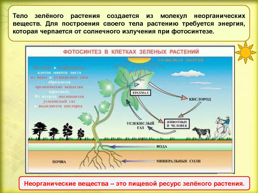Тело зелёного растения создается из молекул неорганическихвеществ. Для построения своего тела растению требуется энергия,