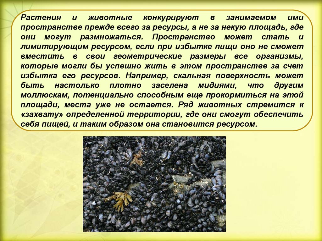 Растения и животные конкурируют в занимаемом имипространстве прежде всего за ресурсы, а не за некую площадь, где