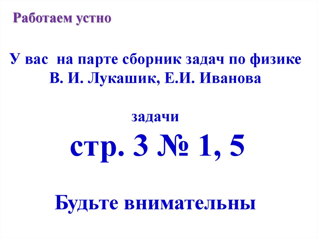 Работаем устноУ вас на парте сборник задач по физике