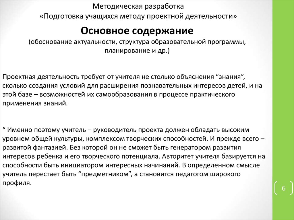 “ Именно поэтому учитель – руководитель проекта должен обладать высоким