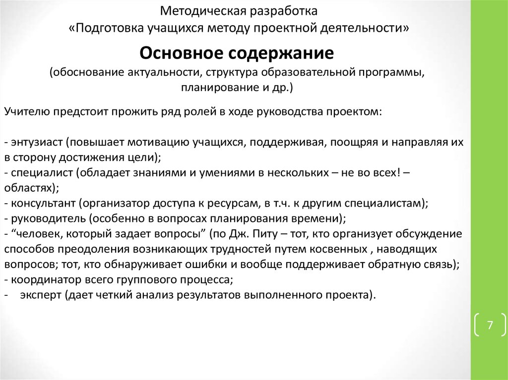 Учителю предстоит прожить ряд ролей в ходе руководства проектом: