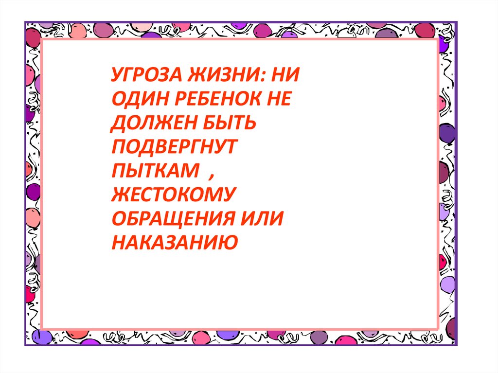 18. Никто не имеет права обижать другого человека, унижать его, жестоко наказывать, мешать учиться, отдыхать, получать медицинскую