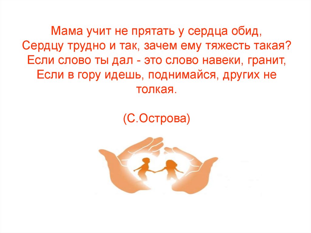 Мама учит не прятать у сердца обид,Сердцу трудно и так, зачем ему тяжесть такая?
