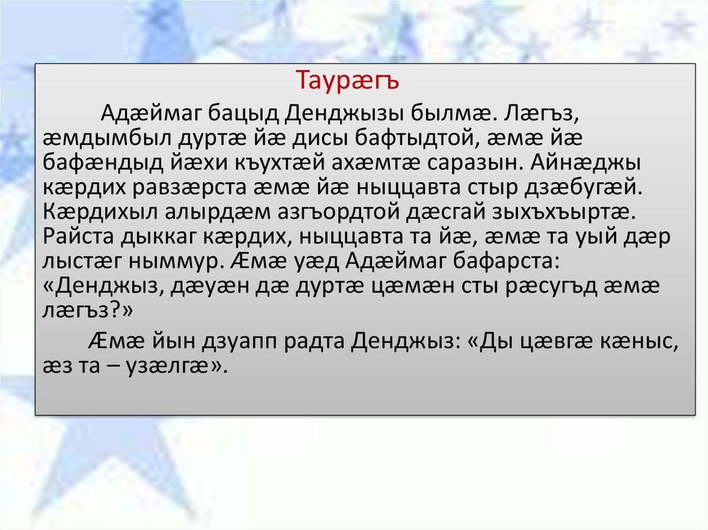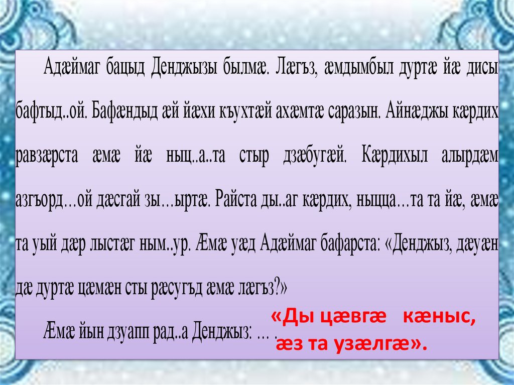 та уый дæр лыстæг ным..ур. Æмæ уæд Адæймаг бафарста: «Денджыз, дæуæн