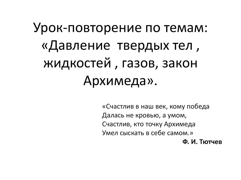 1. Урок-повторение по темам: «Давление твердых тел , жидкостей , газов, закон Архимеда».